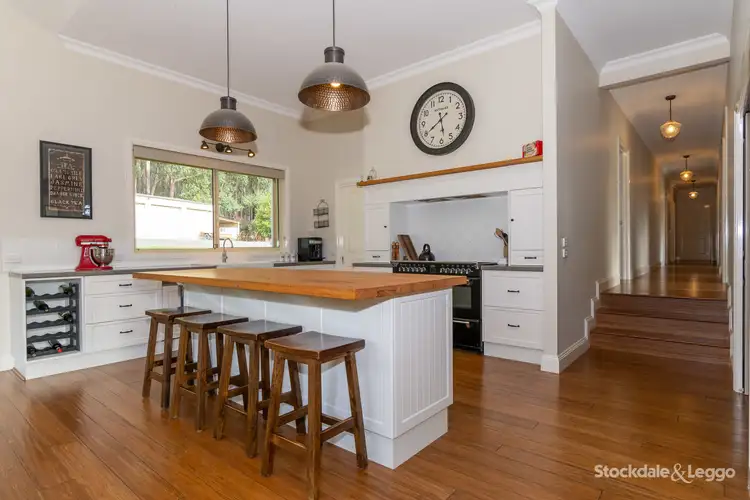 This generous sized home has 4 spacious bedrooms that include a master bedroom with large walk in robe & ensuite; as well as three sizable bedrooms that all have built in robes, ceiling fans and built in desks and shelving. Alongside these are a study that is fitted out with handmade timber desks with built in storage and filing. There are three separate living areas in the home that include a large games/rumpus room or additional lounge at one end; and then as you walk down to a split-level modern country style kitchen & living area, you also find a darkened theatre room. The generous kitchen features a substantial butlers' pantry, large 110cm Belling' gas cooktop, and an ample amount of storage space throughout. The solid wood heater in the lounge area provides more than ample warmth, which is dispersed through the home via the eye-catching timber ceiling fans. Cathedral ceilings and large double glaze windows are a main feature of the living/dining, with the North facing windows providing beautiful light and warm Winter sun.
