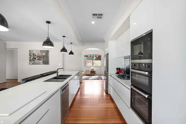 The exceptional chef's kitchen is centrally located, providing easy service to the dining area—perfect for intimate dinner parties or family feasts. Complete with ample bench space, a breakfast bar, loads of storage, a built-in pantry, and a range of stainless appliances, the kitchen is illuminated by pendant lights.