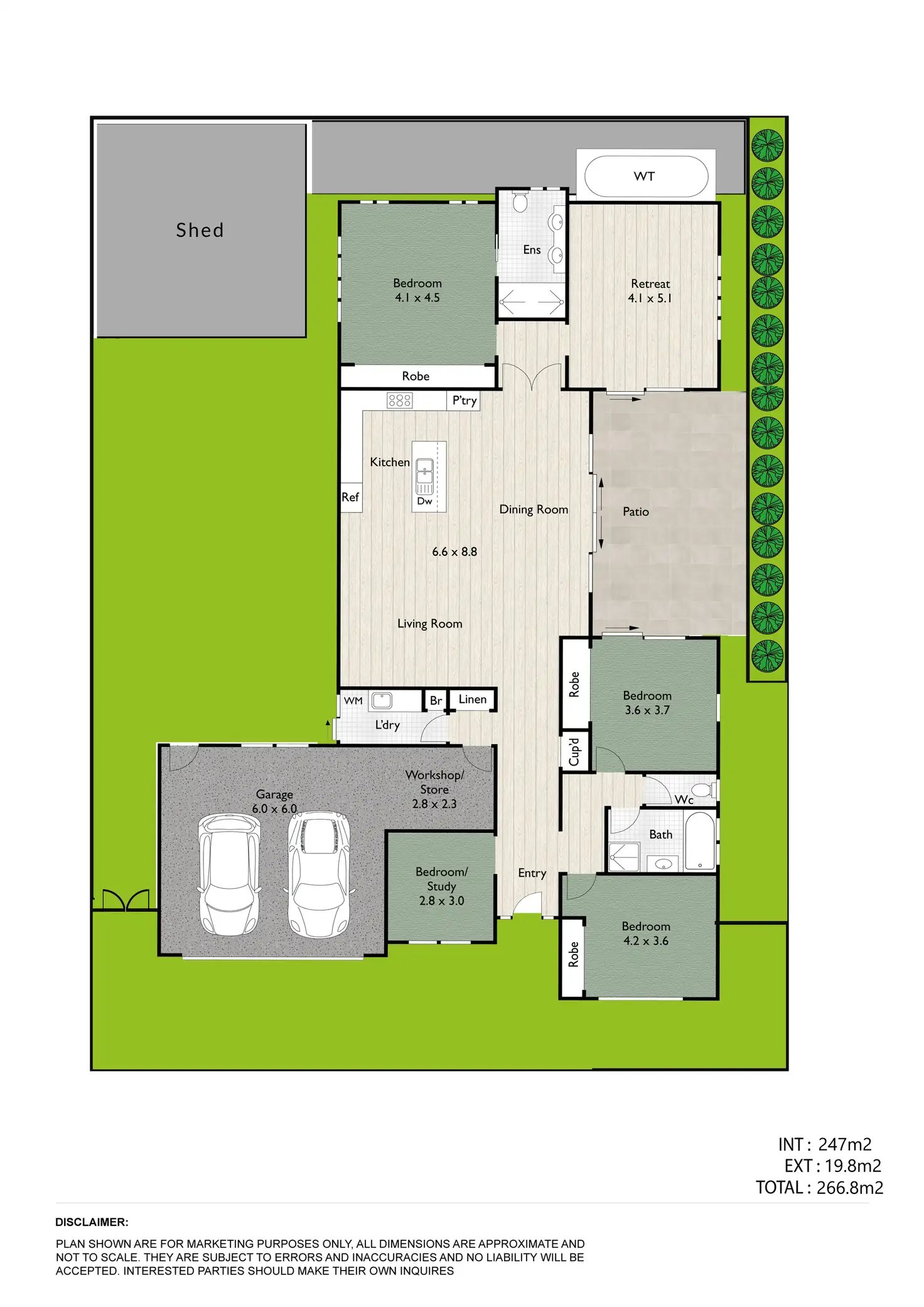 • 6x6 shed with dual roller doors, additional garden shed located opposite side of the home