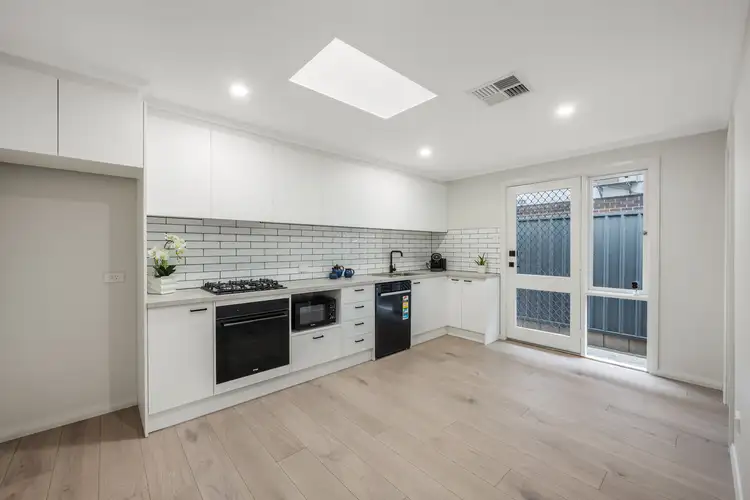 The kitchen impresses with its subway-tiled splashback, sleek black appliances, overhead cabinetry, and generous bench space — combining both style and functionality. The renovated bathroom continues the modern theme with light, fresh tones, while the separate laundry features matching cabinetry and finishes, providing plenty of storage and practicality. Two well-sized bedrooms complete the layout, with the main offering a walk-in robe and the second featuring a built-in wardrobe.