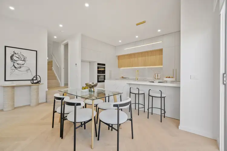Set on approximately 300m², this is a standalone residence with no owners corporation, delivering the independence of your own title without shared costs or management. Spanning around 20 squares, the home has been designed with effortless family living in mind. The ground floor showcases a striking entry, soaring 3m ceilings, and engineered oak herringbone flooring, flowing through to a spacious open-plan living and dining area. At its heart is a gourmet kitchen with premium Miele appliances including 900mm induction cooktop, oven, built-in microwave and integrated dishwasher, finished with stone benchtops, splashbacks and brushed brass ABI tapware.
