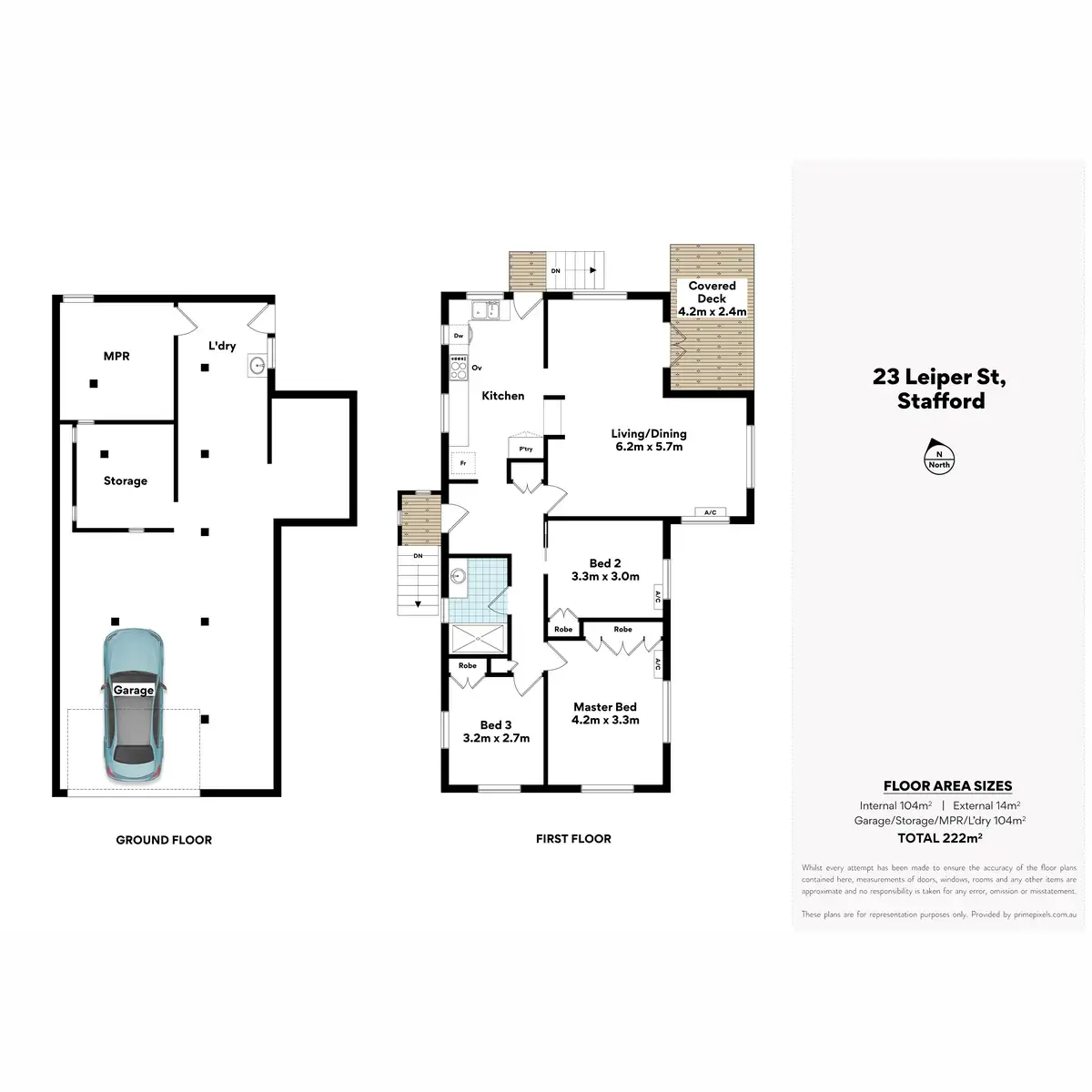 Upon entering the home, you're greeted by a light-filled, open-plan kitchen, living, and dining area that overlooks the expansive backyard, providing a tranquil setting. The kitchen boasts a range of desirable features, including ample bench space, a 4-burner gas stove, and plenty of storage. The main living area is bathed in natural light thanks to the north-facing rear aspect. On this level, you'll also find three additional bedrooms, two of which include custom-built wardrobes and ceiling fans, while the primary bedroom stands out with its spacious built-in robe, ceiling fans, and split-system A/C.