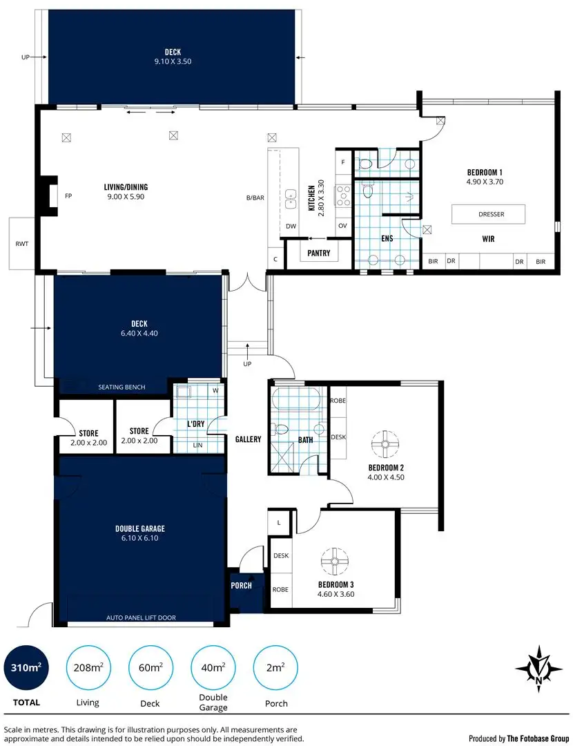 At the other end of the home, you will discover two large bedrooms (both with built in robes and desk), the beautiful main bathroom with full bath, shower, vanity and wc (again with stone benchtops), a large laundry with excellent storage, which opens into a very handy store room. A large double garage with automatic panel lift door will house your cars, while another very handy store room accessed from outside, completes the floorplan.