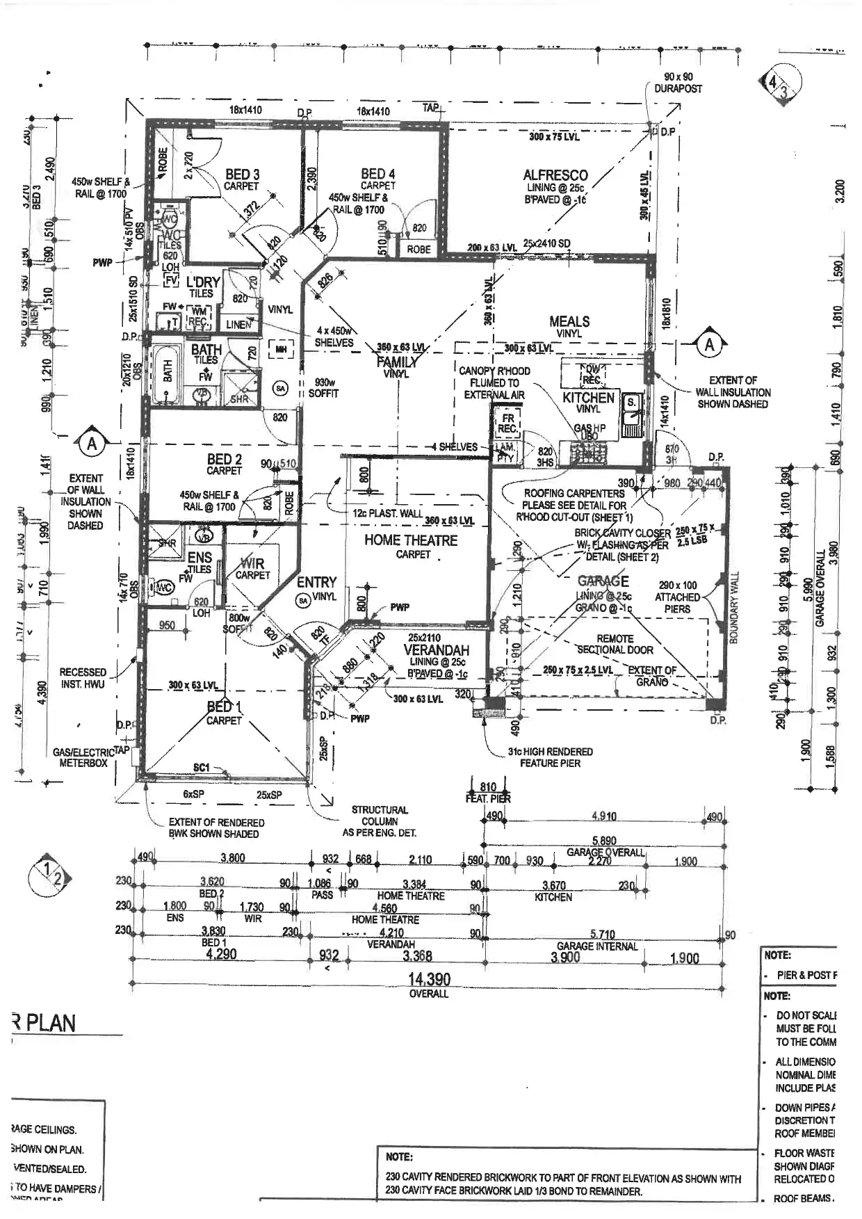The family mome, itself, features 4 biggish bedrooms- all with built in robes- the main, a walk-in. There are two big living areas, (one designated home theatre on the plan), and the generously open-plan, Family, Kitchen, Meals area configuration. This is adjacent to, and flowing out to a good size Al-Fresco, and beyond the fully enclosed backyard with high fences and terraced planters and a nice expanse of lawn.