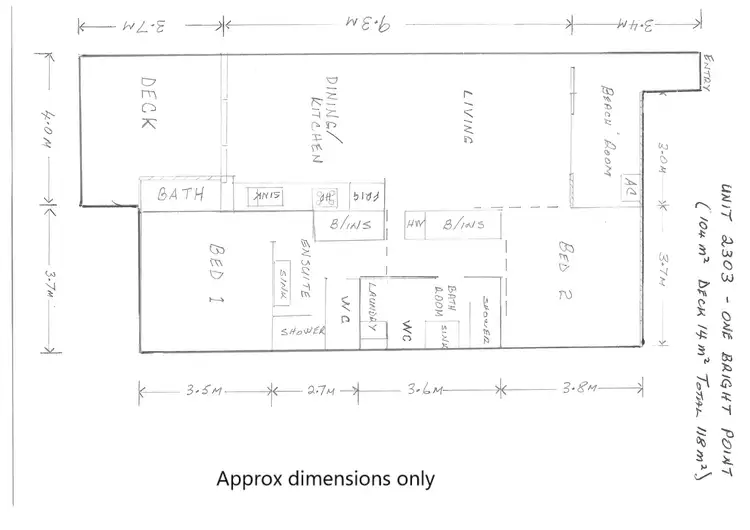 The main bathroom features walk-in shower, vanity and toilet and the laundry is neatly tucked away behind folding doors.