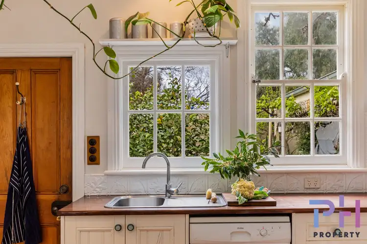 Internally, the floor plan has been sympathetically updated and extended in days past, and consists of three bedrooms, including the master bedroom boasting its own ensuite, walk in robe and lovely French doors to the garden area (also check out to quirky and cool stencilling on the floor!). A secondary internal bathroom services the rest of the home and features pressed metal walls and timber look tiling! The main living area is very spacious, yet feels super cosy for a night in by the telly! And check out the eye-catching stained glass window! Ducted heating and cooling flow throughout the home. Completing the internal layout is the gorgeous cottage style kitchen and combined meals area. Highlights include the country style timber cabinetry and bench tops, large windows with views of the garden, pressed metal splash backs, dishwasher, walk in pantry and gas cooking facilities.