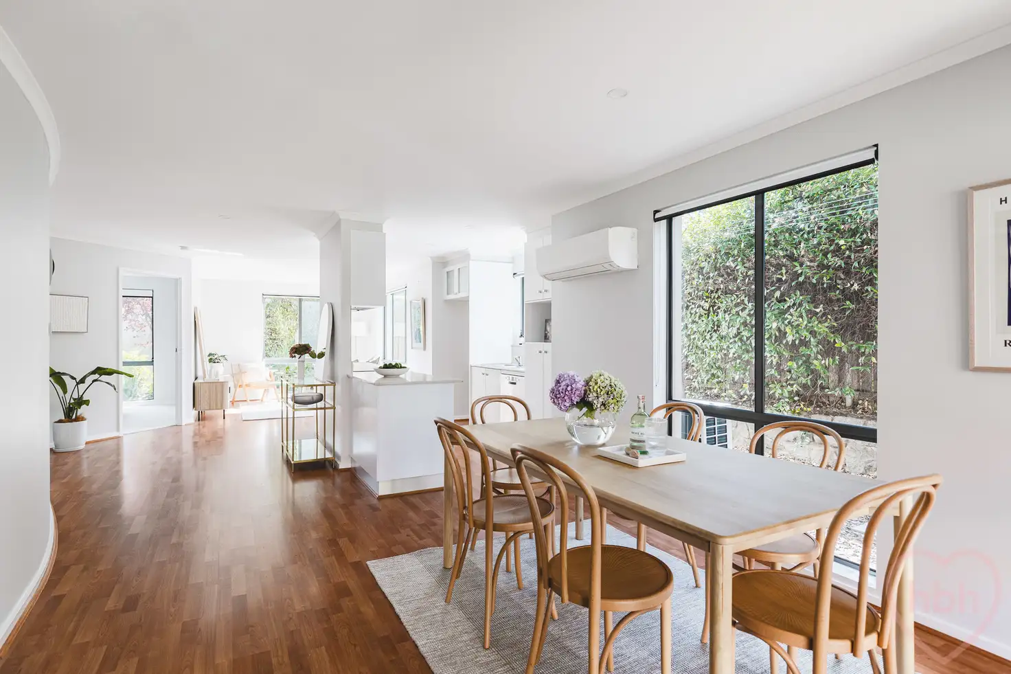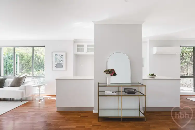 Paths edged in striking blue stone meander past beautifully planted garden beds to this north-facing home, centrally located yet privately secluded within immaculately tended, landscaped gardens. Inside, greenery greets you through every window, the light-filled home enveloped in the immersive colours and textures of a thriving oasis.