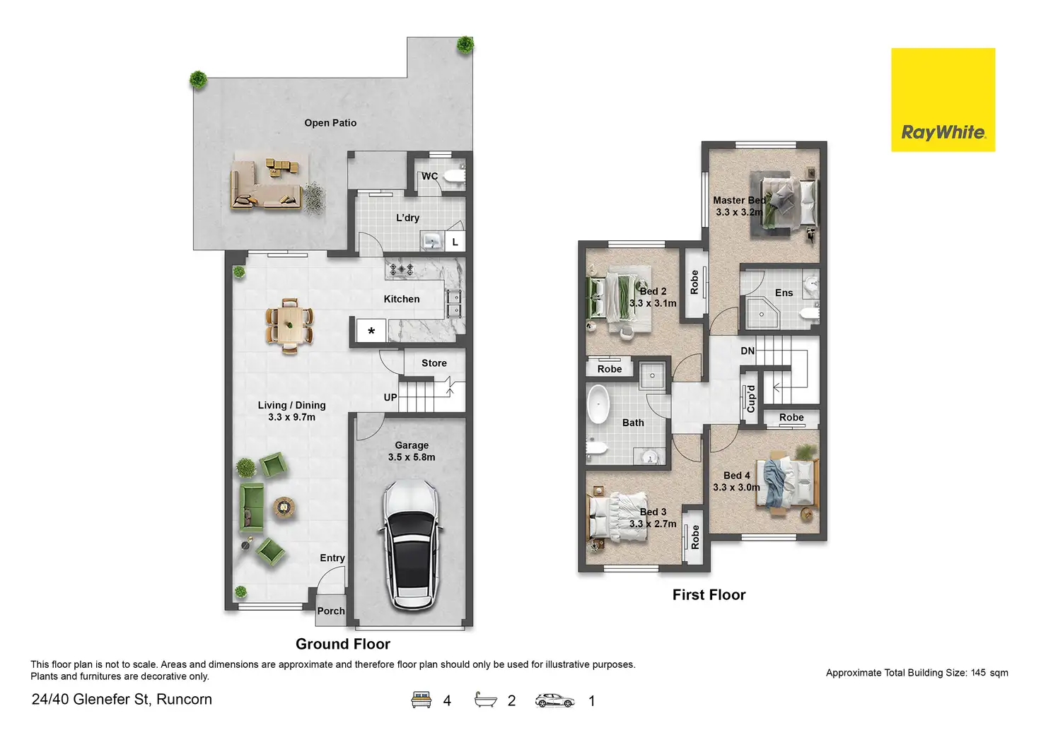• 4 bedrooms, 2 bathrooms, single remote control garage