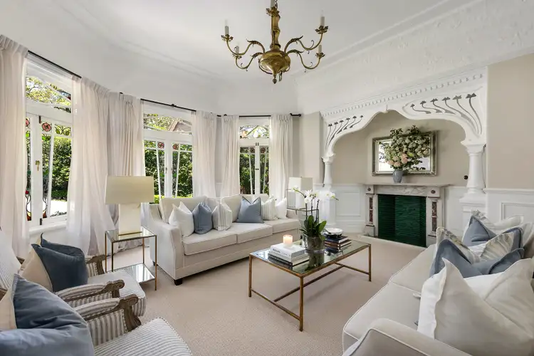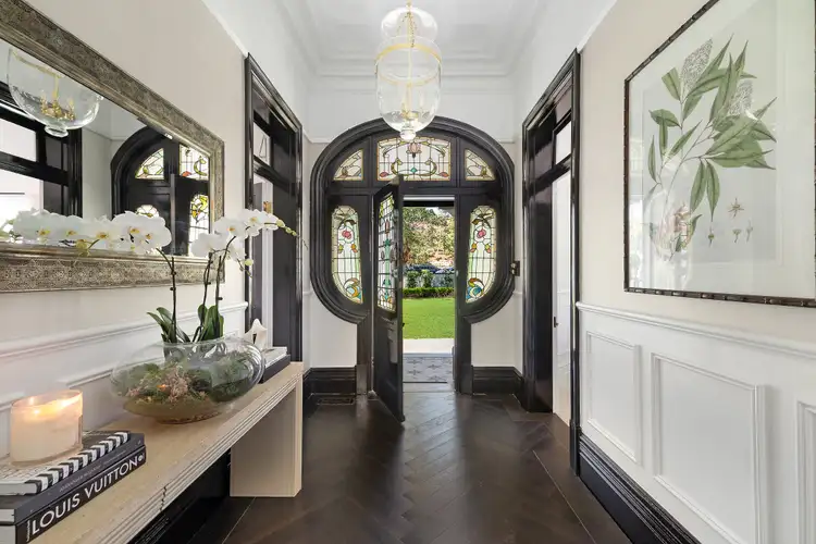 Herringbone parquetry flooring with brass inlays, classic wainscoting, ornate ceilings and marble fireplaces create a seamless dialogue between past and present. Elegant formal lounge and dining rooms flow quietly together, complemented by a generous family living domain and an exceptional marble entertainer's kitchen appointed with dual dishwashers and three ovens.