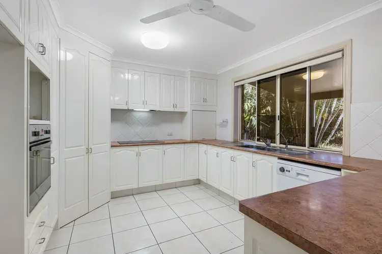 At the heart of the home, the kitchen, casual dining, and living areas flow effortlessly, extending to a tropical oasis outside. The kitchen is a culinary masterpiece, with 2-pac cabinetry and equipped with an induction stovetop and range hood, a wall oven, ample cupboard and bench space, and overlooks the expansive entertaining area. The indoor-outdoor living, perfectly compliments the beautiful Queensland climate and is enhanced by a covered patio and sparkling in-ground salt-water pool, designed for relaxation and enjoyment.