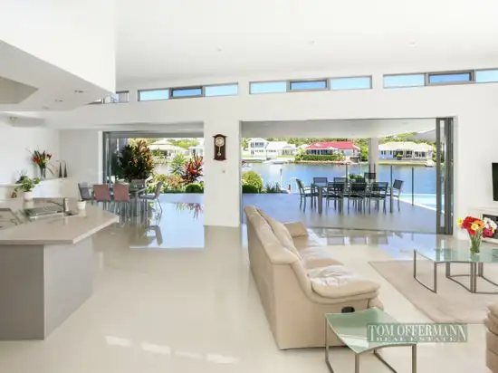 Fastidiously maintained since construction in 2005 by the original owners, a large water feature in the walled courtyard entry holds pride of place and as the main door swings wide the water comes straight into view. A large private study to one shoulder catches the first light and the gleam of porcelain tiles in wall free living areas link to a wonderful under roof poolside terrace in a podium position above the line of a fixed timber jetty while automated drop down screens capture and diffuse the glow of a Noosa sunset.