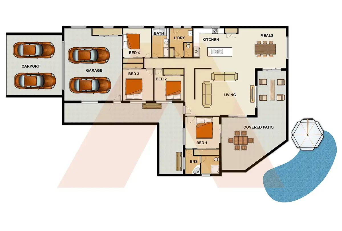 - Open Plan Sunken Lounge and Tiled Dining.