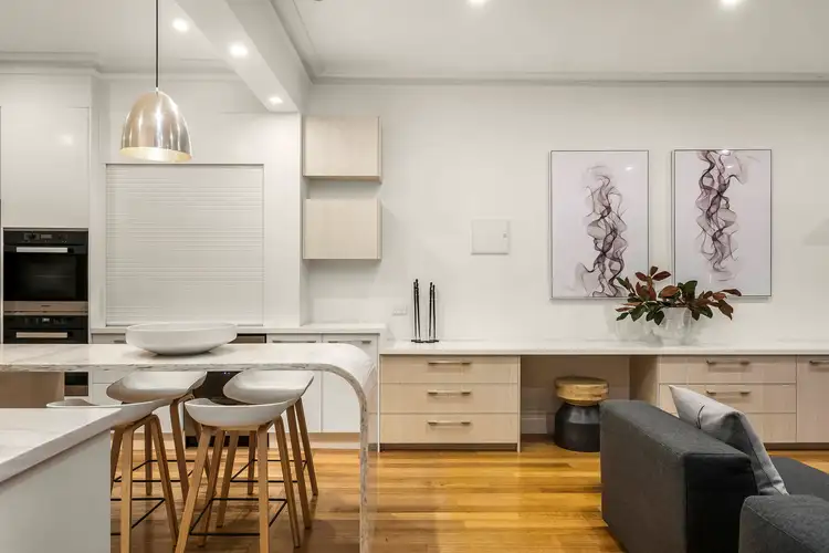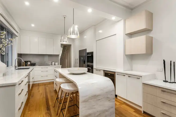 Behind a secure courtyard entry, a magnificent classical façade featuring iron lacework and decorative parapet opens to a traditional arched hall linking formal sitting and dining rooms with decorative rose ceilings, marble OFPs and built in bureau/storage to generously extended open plan areas that feature a stunning contemporary kitchen with Miele appliances, including induction cooktop, two ovens, wine fridge, extensive custom built in cabinetry and significant storage. French doors unfold to private alfresco entertaining and a leafy courtyard full of northern sunshine doubling as secure OSP.
