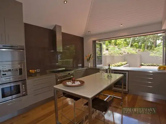 The kitchen is enormous and fitted out with everything the most serious chef could want. Wide stainless steel benches open out through Bi-fold windows and servery bar to service the northern deck and pool areas.