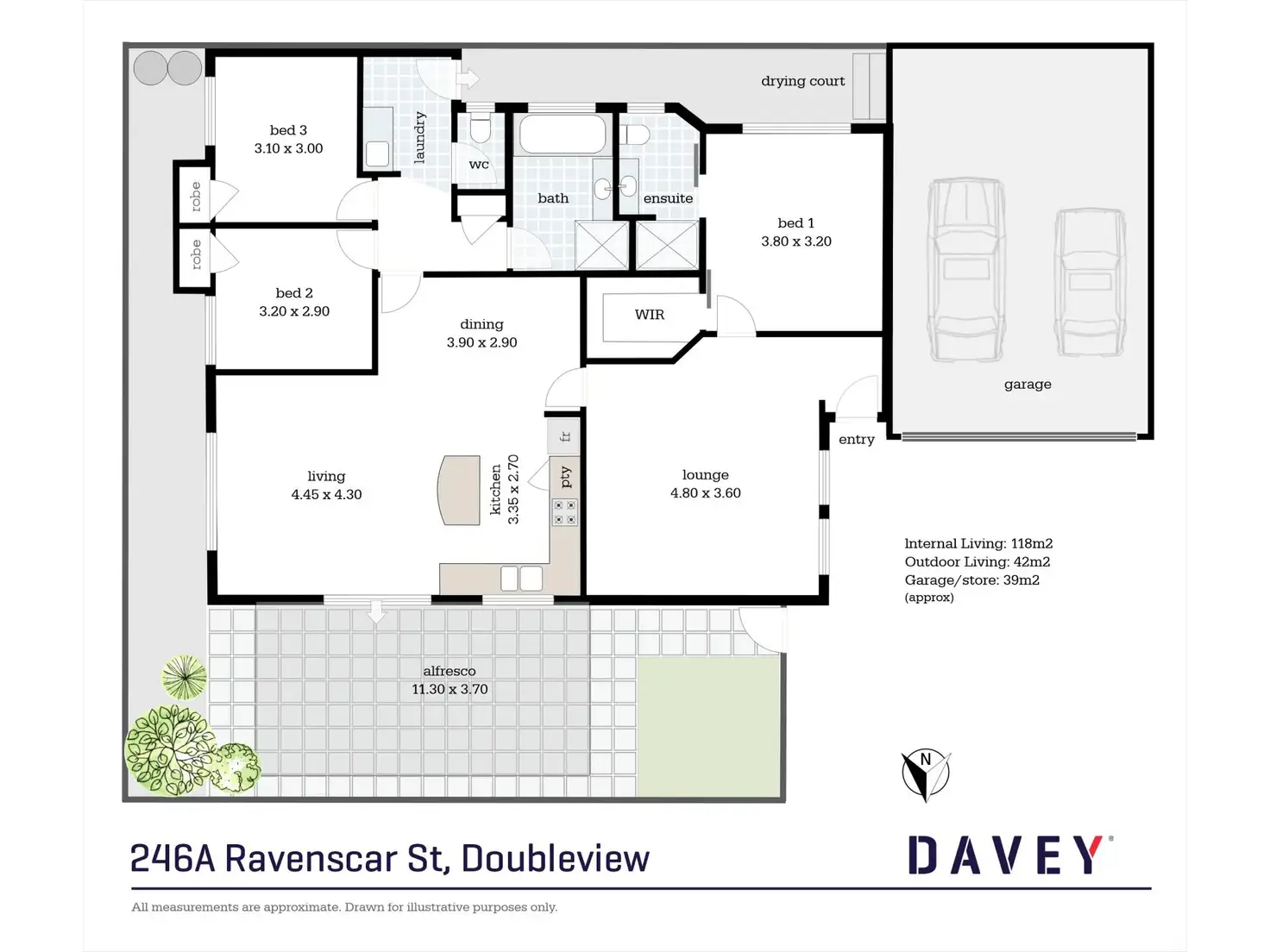 The three generous sized bedrooms all include built-in robes. The master suite with a large walk-in robe plus ensuite is positioned to the front of the home. The two minor bedrooms are separated to the rear of the property with access to a bathroom featuring shower, bath and vanity, with a separate laundry and toilet.