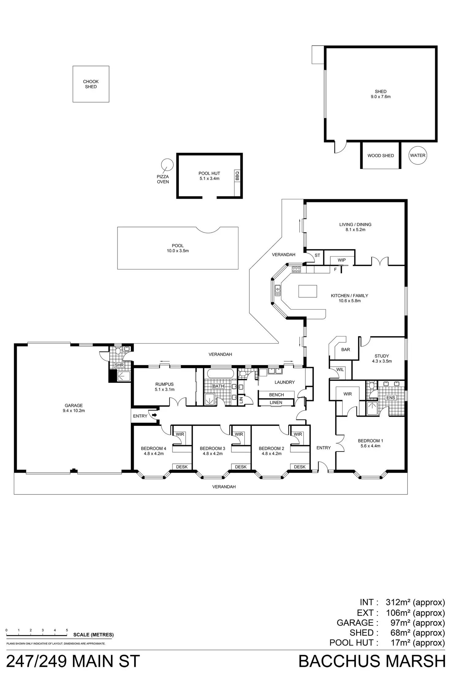 An impressive 4-car garage with drive-through access and an outdoor bathroom (Toilet and Shower) is complemented by a separate workshop, providing the perfect setup for a car lover or extra storage for a growing family.