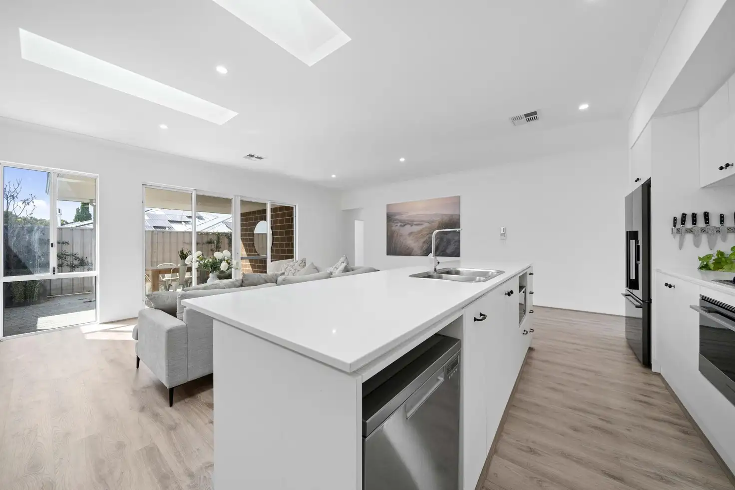 The heart of the home lies in its expansive open-plan kitchen, dining, and living space, where glass-lined walls frame the alfresco and outdoor entertaining area, while skylights showcase the blue sky above.