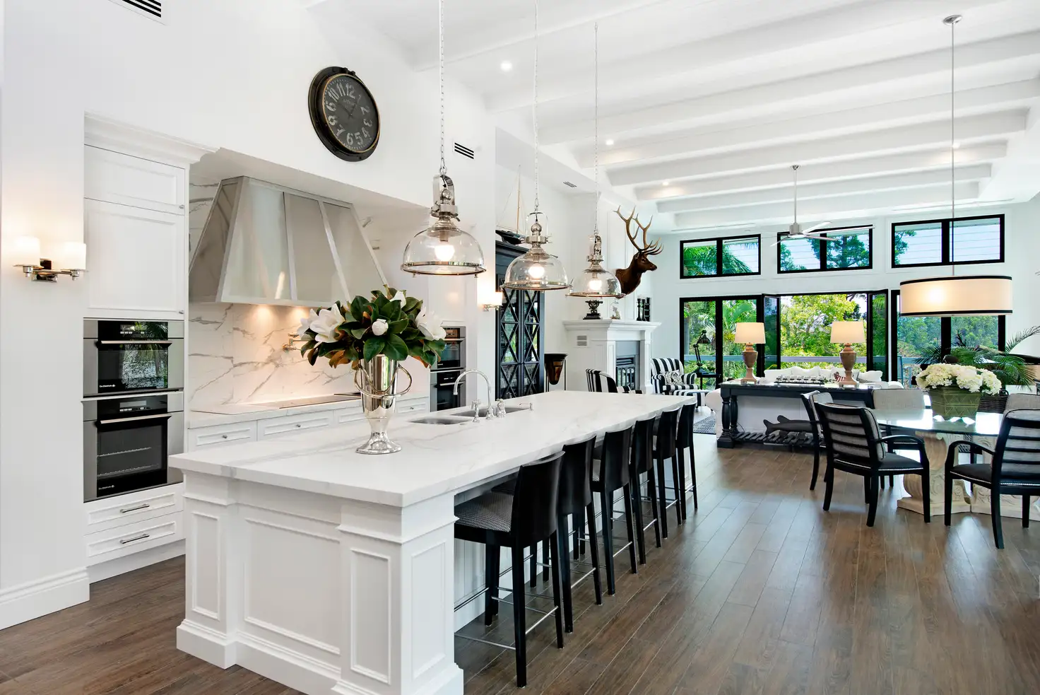 At the heart of this oasis, sits a coastal, beach house, infused with infinite personality. Vibrant interiors mesh with lashings of natural light, and although you’ll be hard-pressed to pick a favourite room in such superb surrounds, expect the kitchen to be where the whole family will want to linger. Pure perfection, it’s adorned with a custom rangehood, supersized neolith stone island bench, acclaimed appliances as well as a butler’s pantry. From here, revel in the open plan living and dining zone. Set under soaring 4.2m exposed beamed, VJ panelled ceilings, and fringed by louvre and oversized windows which overlook glorious gardens and Main River vistas, it leaves you feeling as if the outdoors have been invited into this serene sanctuary.