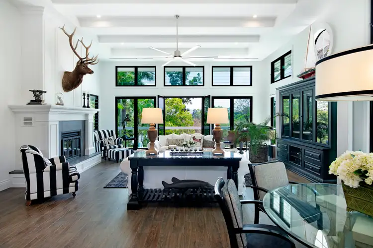 • Open plan living and dining area with wood burning fireplace, and set under 4.2m ceilings, fringed with picture and casement windows;
