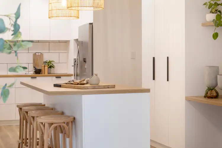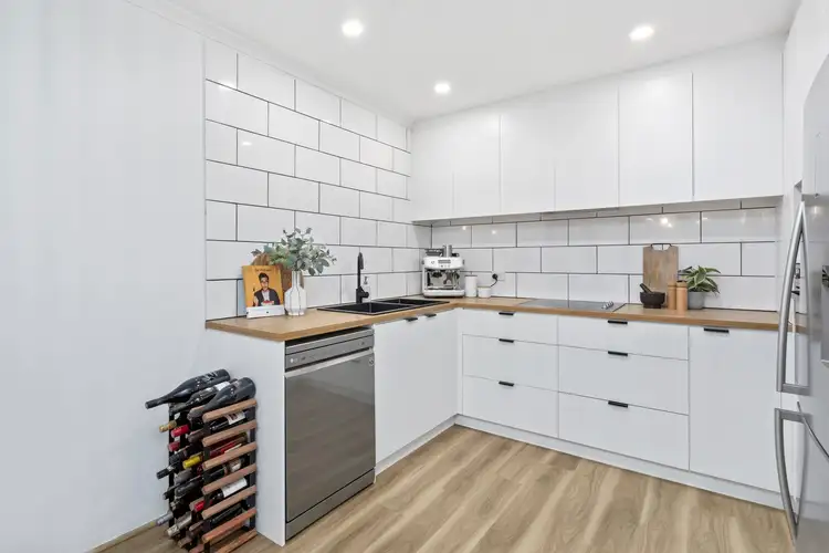 An impressive centralised kitchen layers large format subway tile splashback and timber look benchtops over a sparkling suite of stainless-steel appliances. Overlooking dedicated dining area and stepping down to a lounge with fresh carpets and a combustion fireplace for the cosiest winters on record, it's a home hub optimised for free-flowing ease.