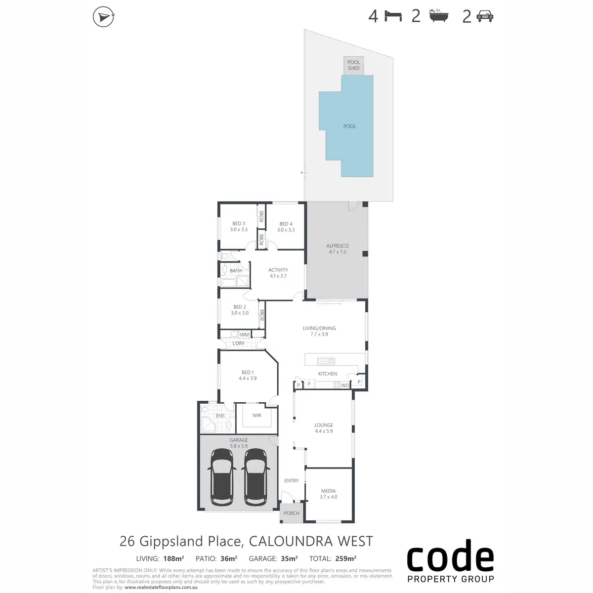 Ducted air-conditioning, ceiling fans, easy-care tiled flooring in living areas, carpets in media and bedrooms, stone benches in kitchen, stainless steel appliances, gas cooktop, separate shower and bath in family bathroom, security screens, solar power, rainwater tank, lock-up garden shed, and dual waterfalls on the pool - are some of the home's appealing features.