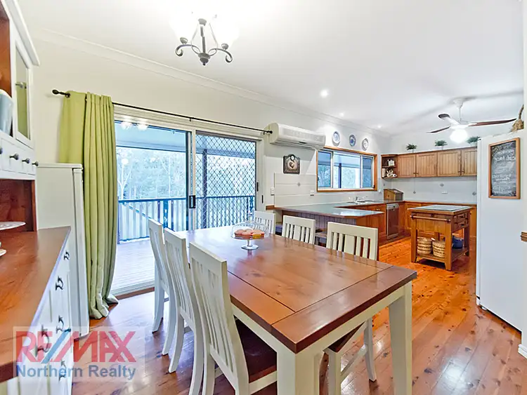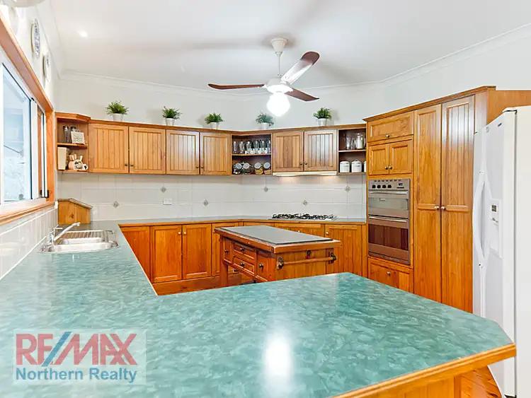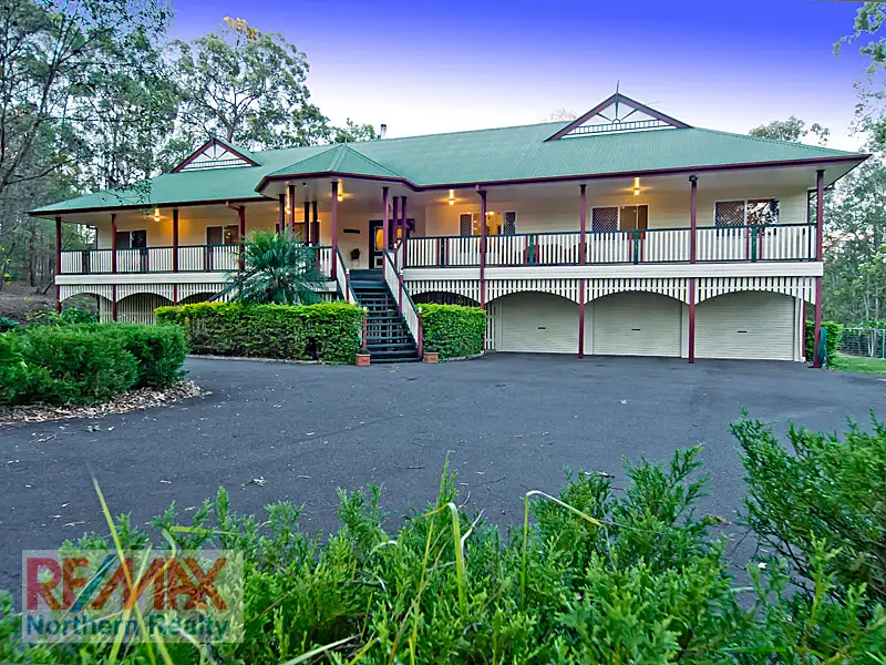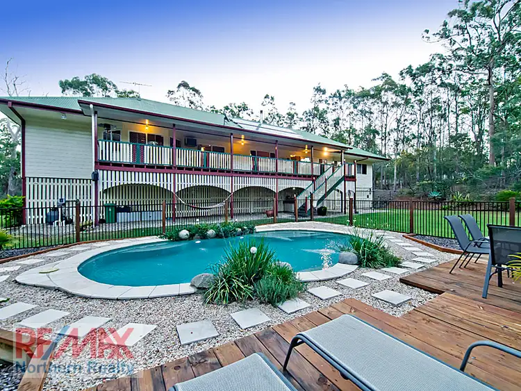 Conveniently located close to Albany Creek, Eatons Hill and Brendale?s facilities, on a picturesque and tree studded 1.5 acres with level turfed expanses around the near new in-ground pool, this spacious and immaculately maintained 5 bedroom and study highset colonial boasts stunning street appeal with it?s full length front verandah and stairs up to the entry rotunda. The main living level upstairs, with its colonial touches like soaring high ceilings and cypress timber floors plus feature fretwork and timber midrails on many of the walls, offers 4 spacious living areas. These comprise a formal dining, separate lounge / media room, a casual family room with cosy combustion heater, and a meals area. The spacious colonial timber kitchen, with modern stainless steel appliances (including gas cooktop) and loads of cupboard storage and long bench spaces, overlooks the extended rear entertaining deck, and both overlook the near new in-ground saltwater pool, it?s extensively landscaped surrounds and beautiful level lawns and tree studded boundaries which offer privacy and a picturesque backdrop.