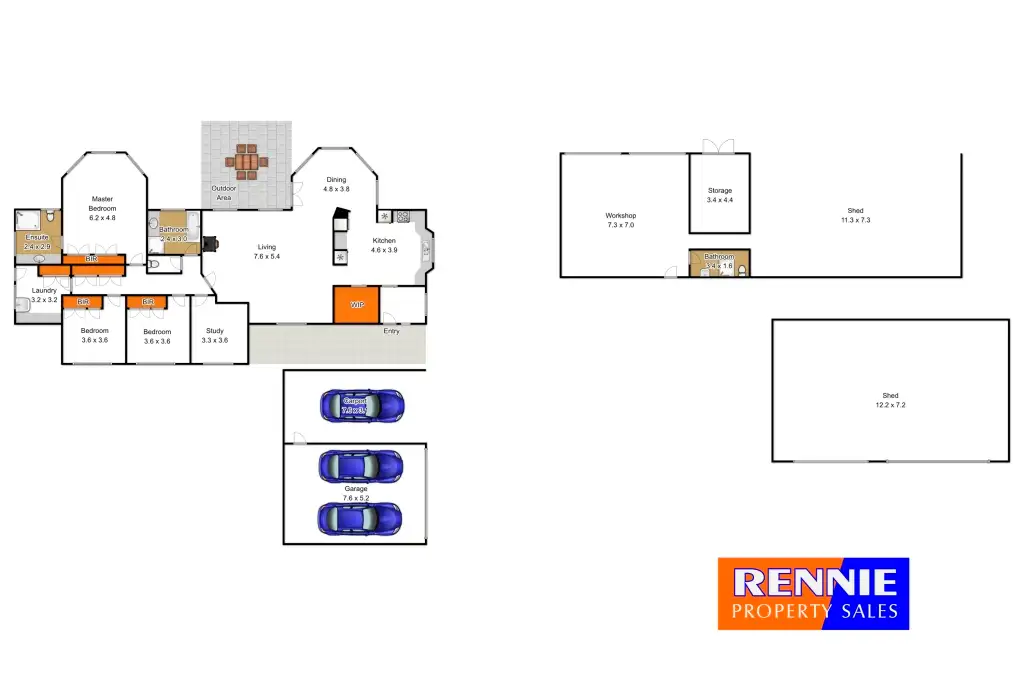 Externally there is an extensive amount of shedding. Aside from the double garage and high roof carport, there is a 12.2m x 7.2 lock up workshop building, an 11.3m x 7.3m open bay machinery/hayshed adjoining further enclosed shedding (7.3 x 7m), secure storage shed (3.4 x 4.4m) with the convenience of it’s own bathroom (shower and WC).