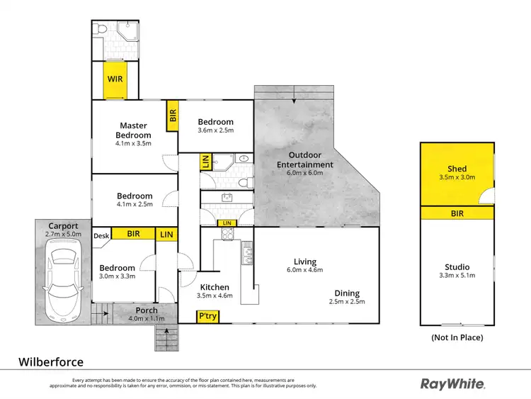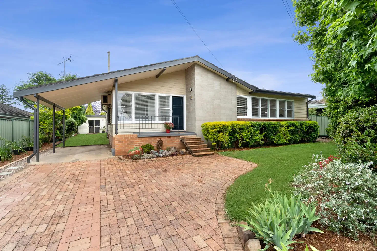 • Drive through side access via a carport to a studio with split system air conditioning and storage cupboard, shed space at the rear + a garden shed