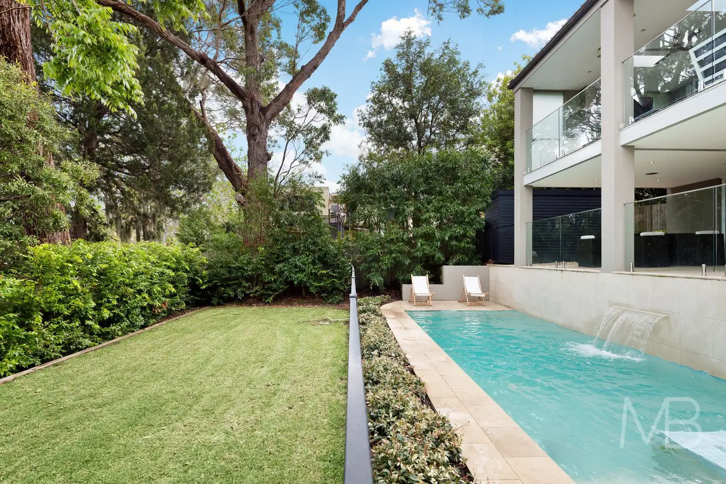 Stunning covered outdoor entertaining upper terrace with leafy outlook and a barbecue kitchen, lower terrace adjoining the pool and rear garden