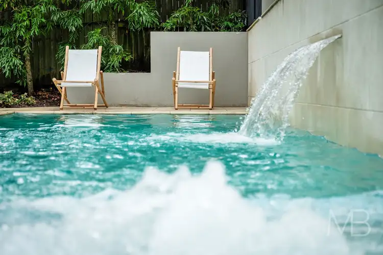 Shimmering aquamarine pool with water feature and spa, great for cooling summer dips or doing laps, hot/cold outdoor shower