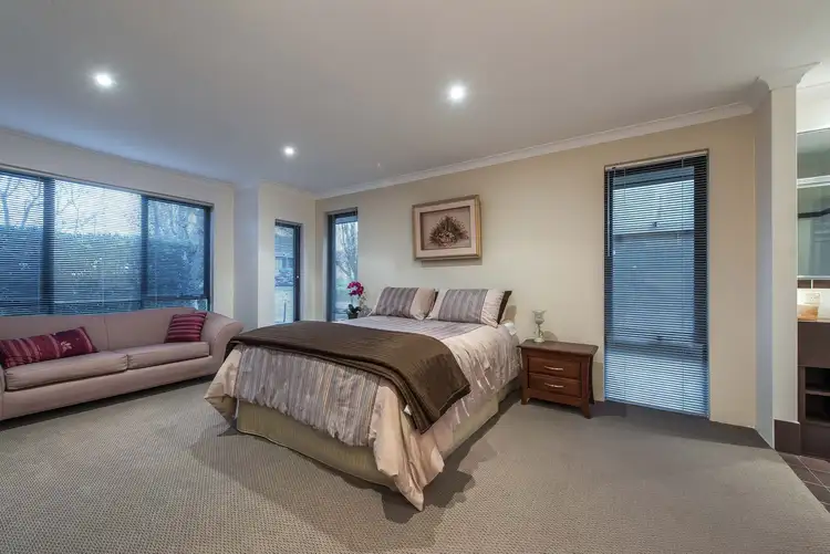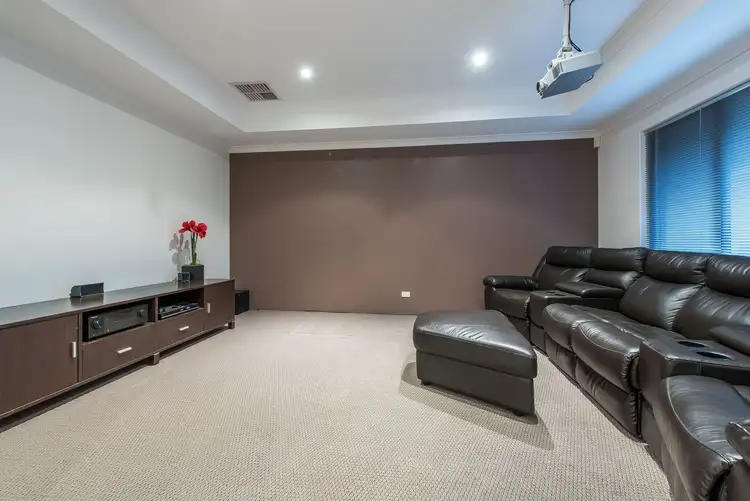 Sliding doors reveal a commodious front theatre room that, like all of the bedrooms, is carpeted for comfort whilst also enjoying the bonus of a striking feature wall and a recessed ceiling. With open window recesses for mum and dad to keep an eye on the kids and their homework, a custom study area with a built-in multi-person desk-come-work station services the minor sleeping quarters that are perfectly positioned right away from an over-sized master suite where a parent’s retreat area meets a giant walk-in wardrobe, a splendid garden aspect to wake up to and an intimate ensuite bathroom with a shower, separate toilet and “his and hers” twin vanity basins.