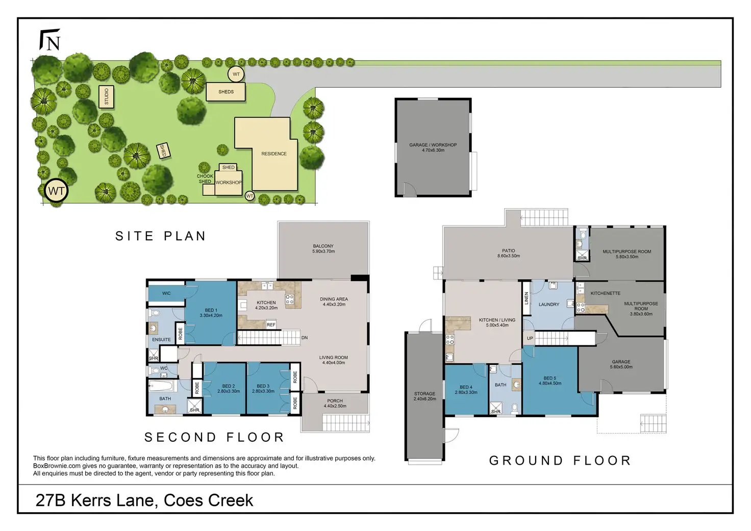 Across two levels the home comprises five bedrooms, four bathrooms, kitchen plus 2 x kitchenettes, separate living areas and multipurpose rooms, upper north-east facing balcony with pleasant rural outlook, covered patio on ground level, separate laundry, and lock up garage.