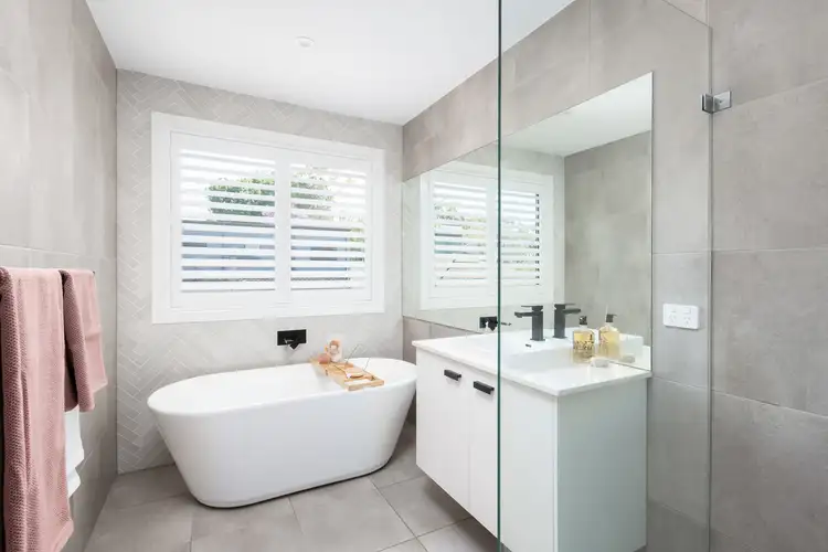 - Stunning family bathroom presented with beautiful herringbone feature tiles, floating vanity and basin, large freestanding bathtub and separate shower with dual shower head.