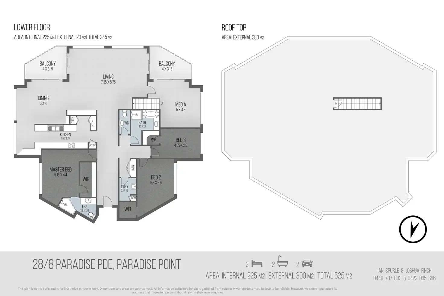 The apartment comprises three bedrooms, two full bathrooms (primary bedroom with ensuite), open plan living dining, galley kitchen (with great storage) and a separate media/study room that provides access to the stairs and rooftop area. There are two further balconies on the apartment level and two single-side by side garages.