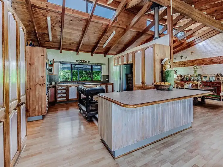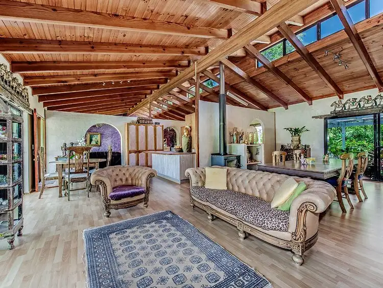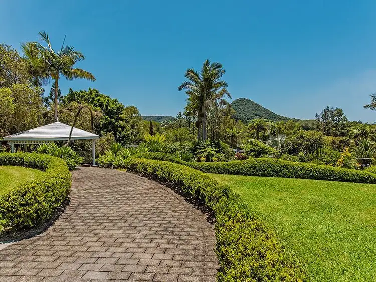 Set in the rolling lush hills of Pinbarren in the midst of the Noosa Hinterland lies hidden from the road this uniquely designed European style home. Immediately impressive are the high cathedral ceilings supported by exposed Oregon beams beautifully complemented with tongue and groove cypress pine, all of which are emphasised by the diffused light afforded by the south facing clerestory windows. In perfect harmony is the open plan living of the French accented kitchen and atmospheric and spacious dining area, which would delight any chef. Additionally, a wood fire exists providing for a cosy winter. The formal sitting area affords magnificent views of Mt Pinbarren through the property?s engaging, lush garden enticing one to relax and unwind. There are 4 very generous sized bedrooms, all boasting large picture windows with splendid private garden views. The main is enhanced with a walk in robe and ensuite. Other features of the property include a double lockup garage and an enormous 12m x 6m shed containing a mezzanine level and workshop ideal for a boat or caravan, attached and complementing this structure is a good sized tool shed. There are 4 x 22,000 litre concrete water tanks to harvest the generous rainfall of the area helping to keep the garden looking spectacular year round. The stunning home and facilities and setting are just the beginning of this property has to offer. The garden complements the home as a massive outdoor living space for entertaining special guests, hosting weddings and other functions or for your own private enjoyment. This established, self sustaining, mature, European flavoured garden is embellished with classical sculptures, arbour walkways, paved areas with a multitude of mini views enhanced with traditional park benches to sit and admire the divine atmosphere and uplift the spirit to joy.An elegant gazebo sits nestled in the midst of all the beauty, ideal for outdoor lunches, breakfasts, cocktails, study or reading.