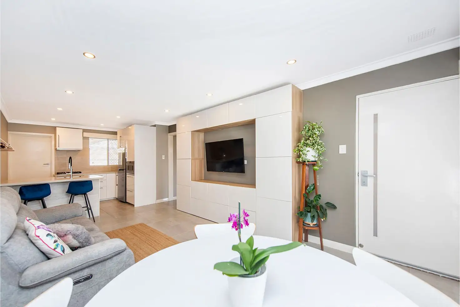 Welcoming you inside is an impeccably-tiled open-plan dining, living and kitchen area with split-system air-conditioning and built-in cabinetry offering lots of storage. The TV is mounted on the wall and can swivelled to watch while cooking, lounging or dining. The beautifully renovated kitchen includes seamless acrylic benchtops, sleek white soft closing cabinetry with lights in all draws and in an integrated dishwasher. It has a gas cooktop, range-hood, oven and microwave appliances.