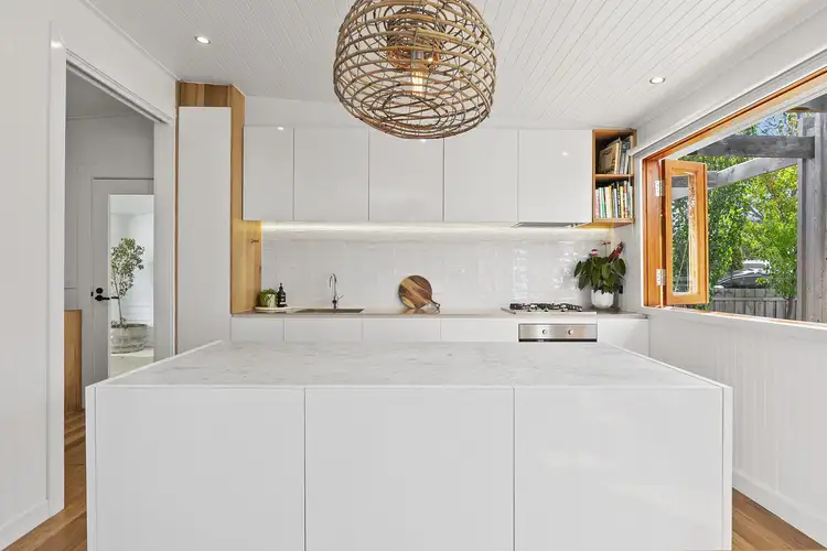 Upon entering you are greeted with a fusion of timber lined ceilings, spotted gum flooring and bright tones that permeate a relaxed and light-filled, open plan lounge / kitchen / dining zone. A spacious, north facing, entertaining deck area is accessed by large bi-folds with the added bonus of a servery from the kitchen creating a real coastal lifestyle ambiance.