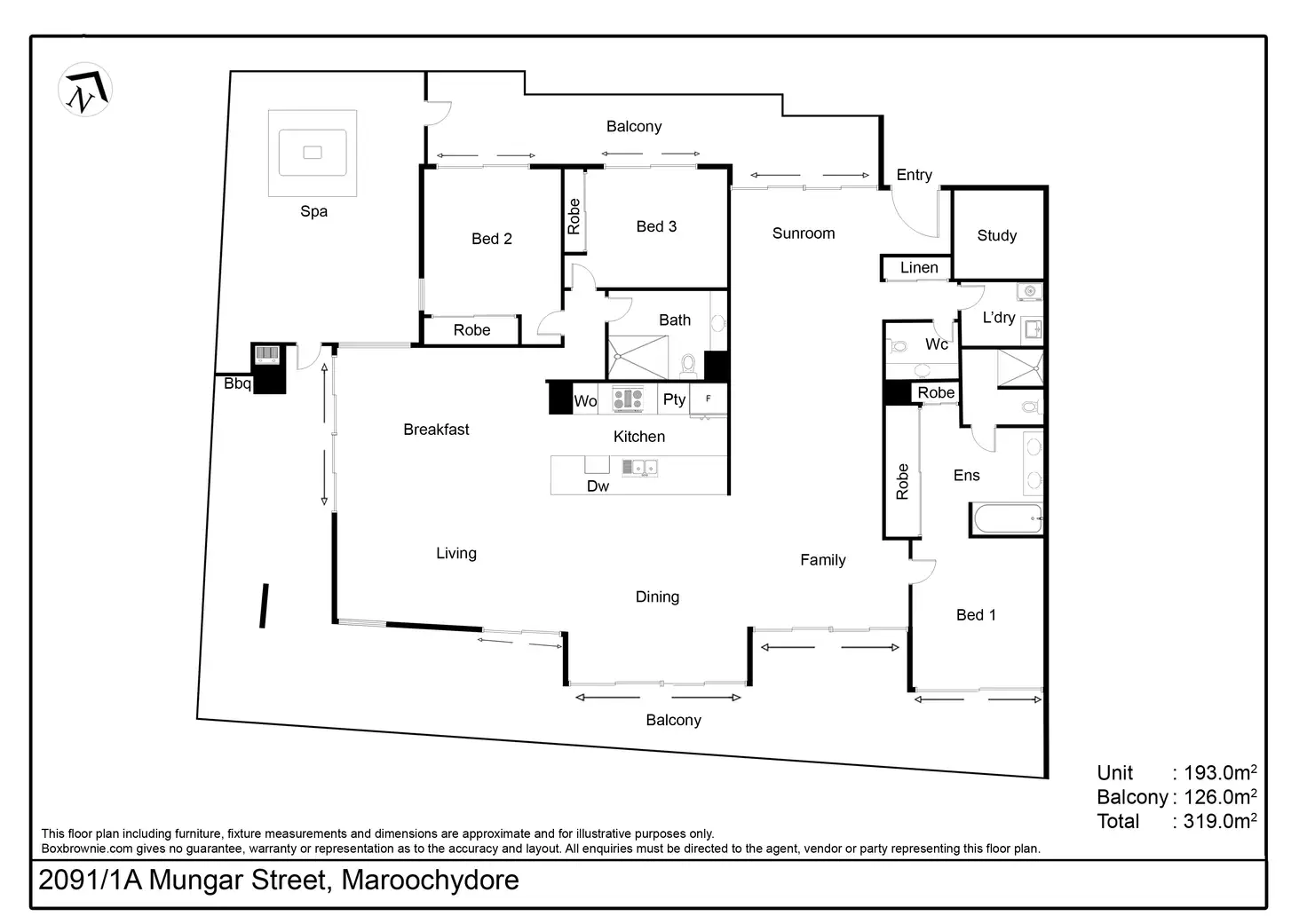 With a total of 319m2 of living, including 126m2 wraparound balcony; the living is expansive, and the view is spectacular sweeping across the CBD to the north-east showcasing the ocean and river mouth and over to the west to the hills of Buderim; breath-taking by day and enchanting by night when the coast lights up! There is even a spa on the balcony to admire the vista over a glass of bubbles.