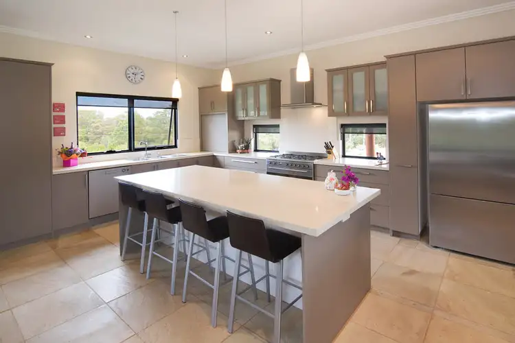 The custom built house is cleverly designed with the North facing aspect making the best use of its solar passive effect. The home is compromised of 2 living rooms that are connected with a foyer that will lead you to the enormous open plan living/ kitchen/ dining and shows off that gorgeous sandstone tiled flooring that runs throughout the house. There are the wide doors that allow the northern sun to spill through the room and lead you to a spacious covered deck that presents you with a stunning outlook out onto those landscaped gardens with a very pretty lily pond........somewhere you could sit for hours in relaxed bliss!