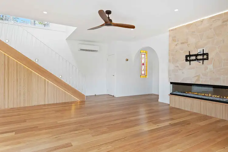 Downstairs, the home offers a stunning gourmet kitchen with a large island bench, flowing seamlessly into open-plan living and dining areas. The living space showcases built-in cabinetry, a stone feature wall and fireplace, and opens directly to the covered outdoor patio and sparkling pool—ideal for entertaining all year-round.