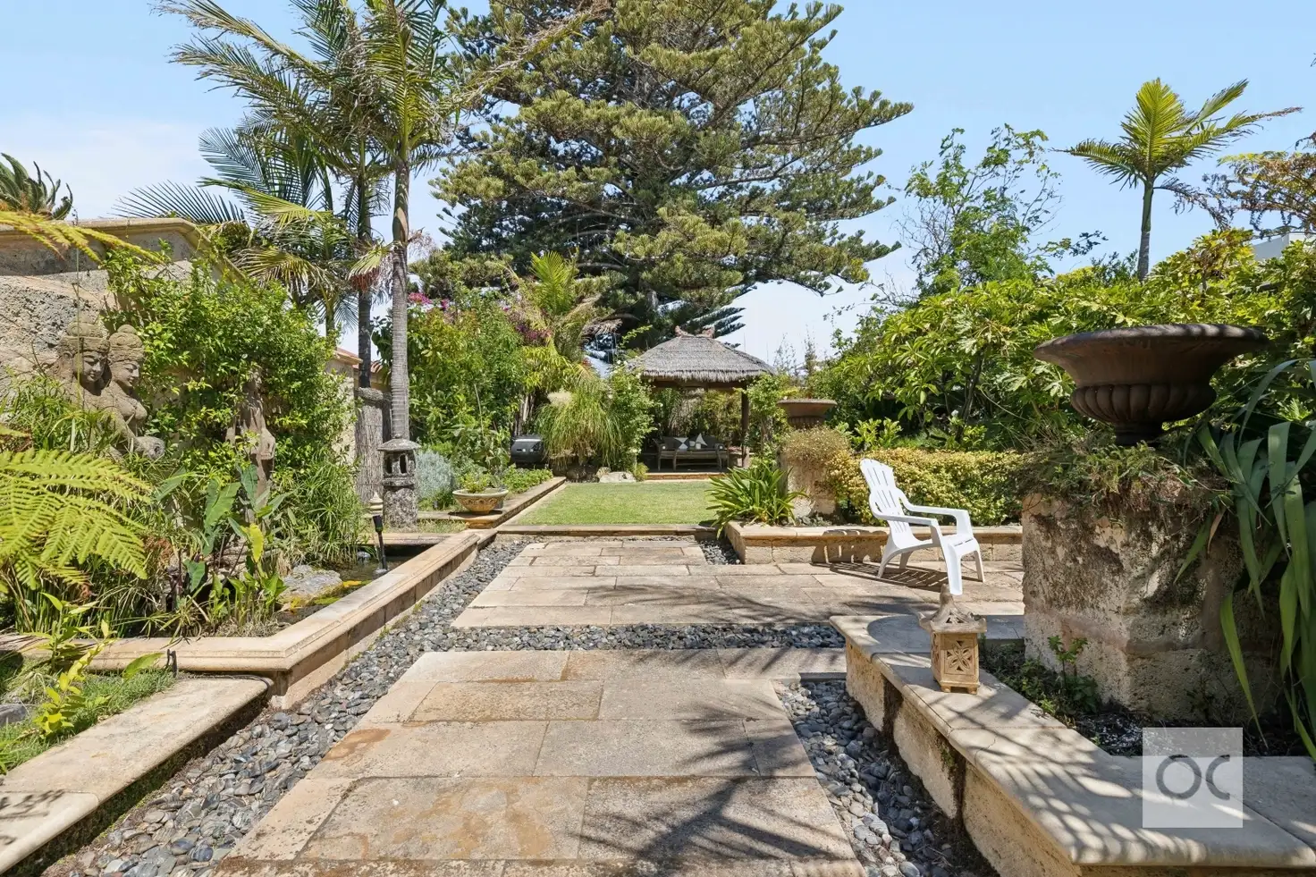 Step outside into a private tropical oasis, where a Bali-inspired backyard invites you to relax and entertain in style. Lush, established gardens frame a tranquil pond with a water fountain, a thatched Bali hut for shaded retreat, and an outdoor shower for a refreshing rinse after a day at the beach. A designer glass verandah ensures this space is enjoyable year-round.