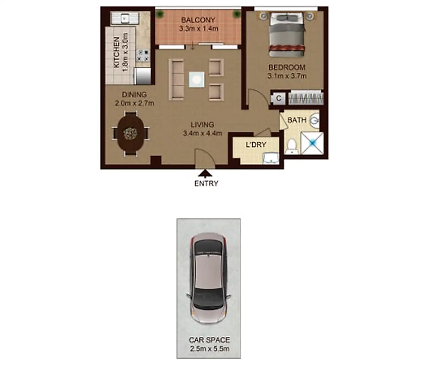 1 Bed • 1 Bath • 1 Car
