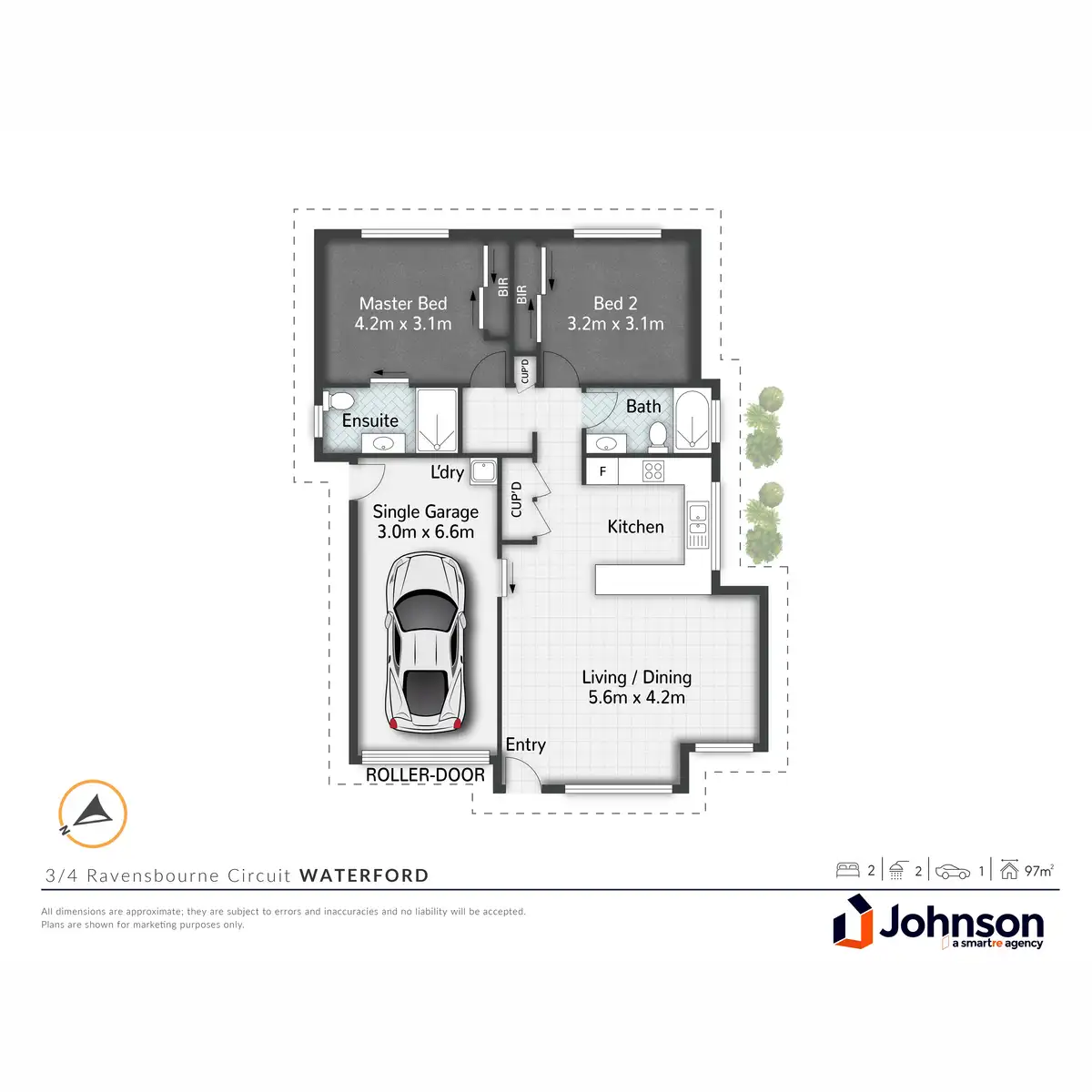 The two generously sized bedrooms both come with built-in wardrobes, offering plenty of storage. The master bedroom includes its own ensuite bathroom, ensuring privacy and convenience. The unit is further complemented by a shared rear court yard with the adjoining 2 units.