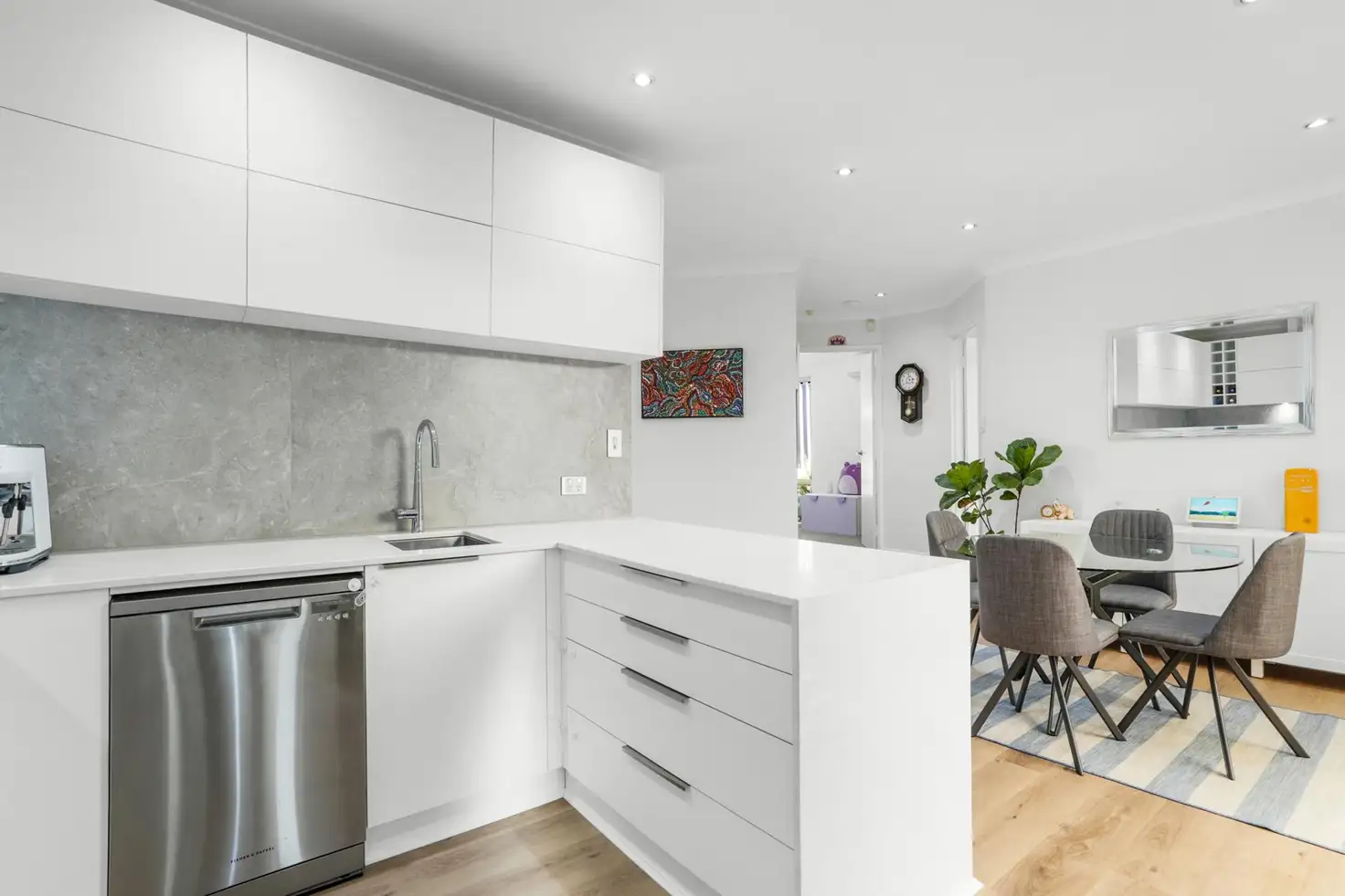 The kitchen is a contemporary masterpiece featuring elegant stone benchtops and abundant storage with both under-bench and overhead cabinets, all highlighted by a chic marble-look splashback. High-quality appliances, including a four-burner gas cooktop, integrated rangehood, built-in oven, built-in microwave, stainless steel sink and a dishwasher, ensure culinary excellence. Adjacent to the kitchen, the laundry room offers ample storage space, a separate toilet, and a convenient shopper's entry access to the single car lock-up garage, making daily life a breeze.