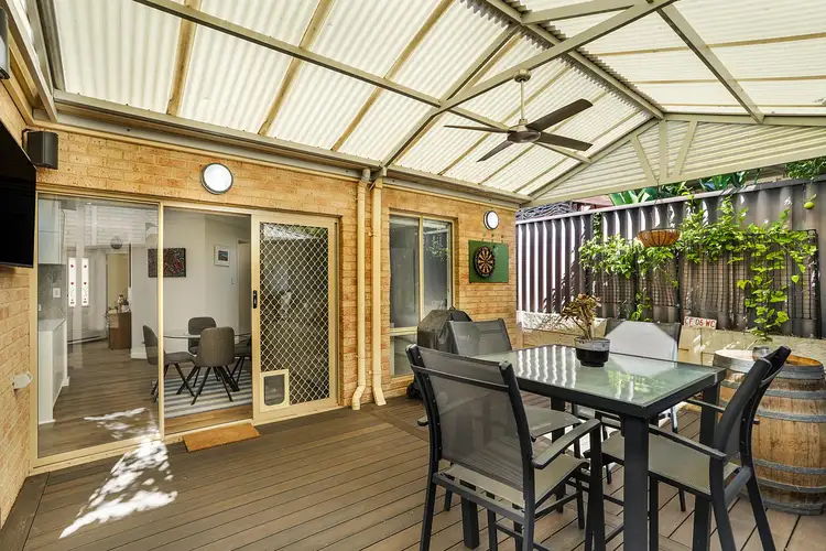 Sliding doors open onto the decked alfresco area, featuring a spacious pitched patio and artificial turf, creating a perfect play space for little ones. A ceiling fan provides relief during scorching summer months, and convenient direct access to the external garage/store room, providing ample storage for all your extra belongings. This low-maintenance entertaining space is the ideal outdoor retreat.