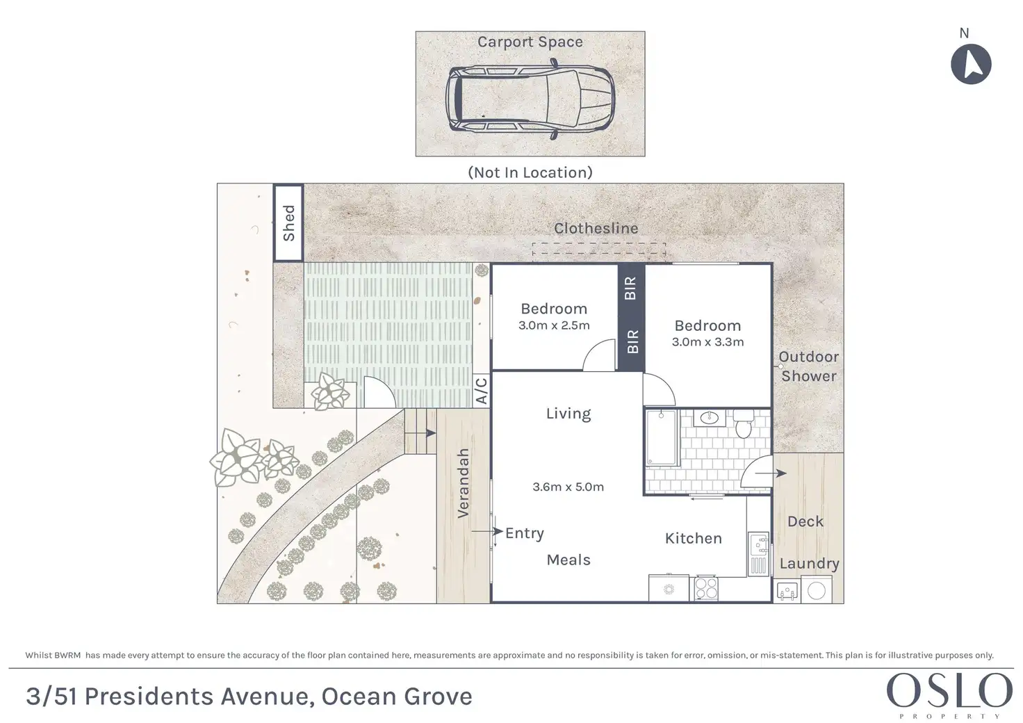Outside: Introduced by established gardens, this fully-utilised allotment enhances every corner of its space, featuring. a private turfed grass area complete with a garden shed, and a rear deck with laundry facilities, both linked by exposed concrete complete with a clothesline and outdoor shower.