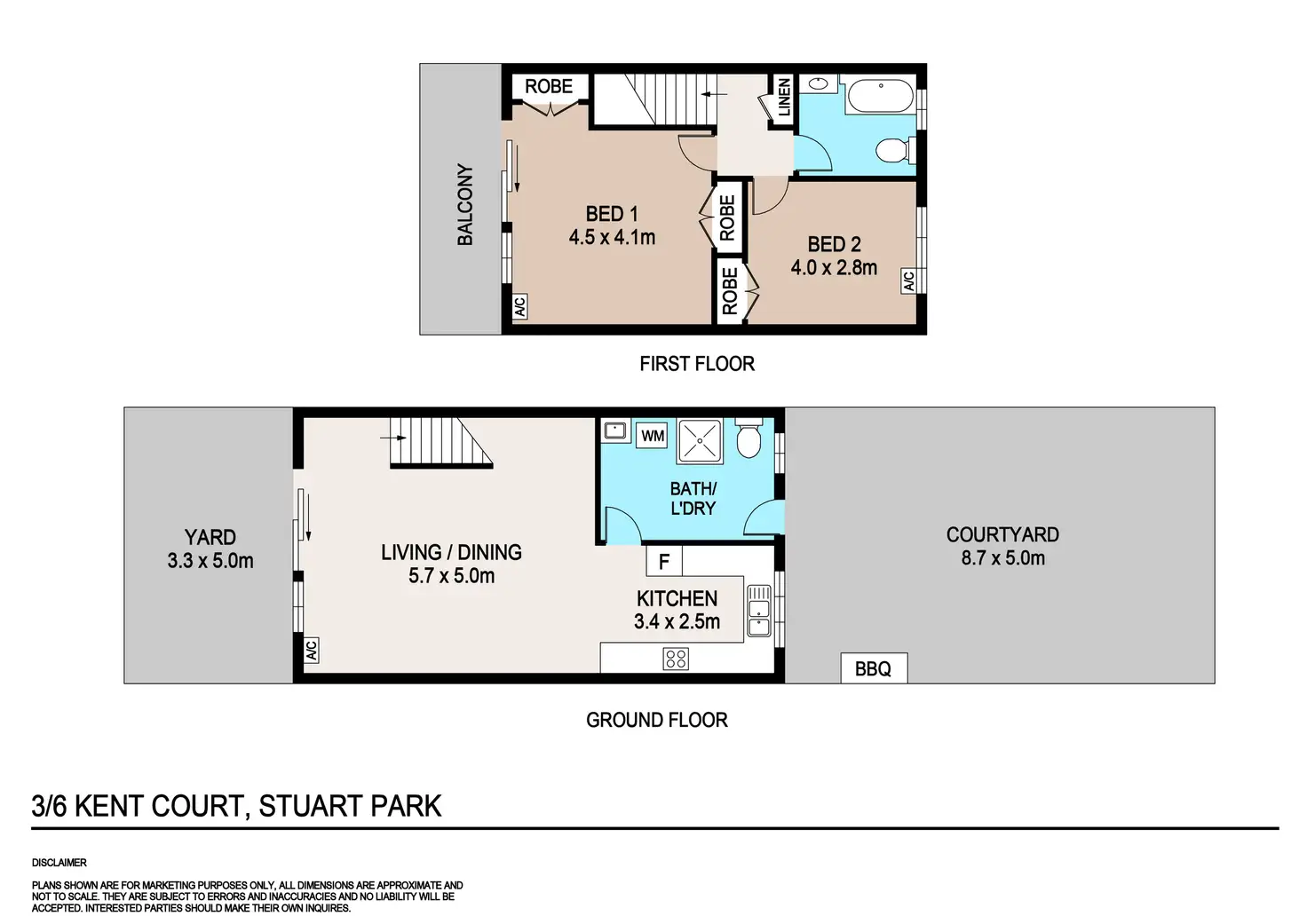 Conveniently positioned to adjoin both the open-plan and rear courtyard, the bathroom and integrated laundry offer excellent practicality within this well-thought-out floorplan, while upstairs, the second bathroom services two robed bedrooms.