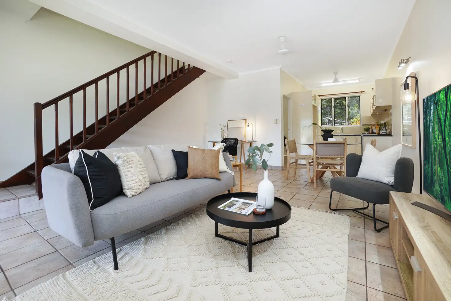 Stepping inside, you find a surprisingly spacious open plan, offering plenty of space for your lounge and dining set, along with a study or reading nook under the open timber staircase. Overlooking this is a neat kitchen with a gas stove and plentiful counter and cabinet space.