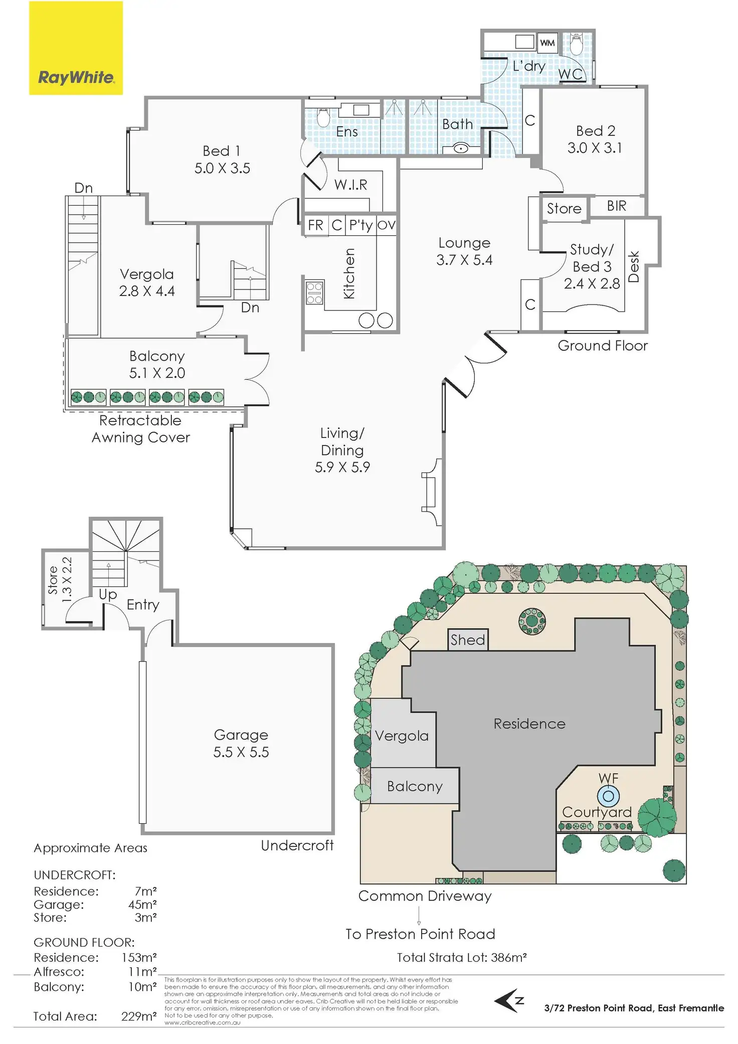 A walled, leafy courtyard with a fountain catches the morning sun, a serene space to enjoy a morning coffee while a separate balcony with a retractable awning and pergola roof provides a welcoming alfresco area to entertain or simply enjoy family meals watching the boats pass by.