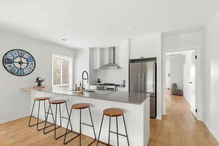 Kitchen – Beautifully updated galley kitchen and meals area with stone benchtops, quality appliances including a freestanding 900mm wide oven with gas cooktop, breakfast bench, bespoke pressed tin splashback and built-in pantry
